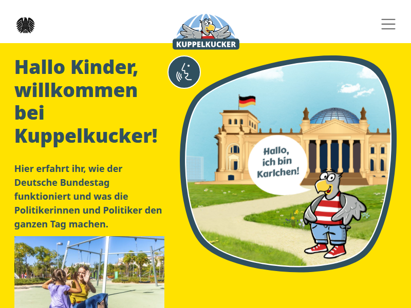 Politik für Kinder: Wie entsteht ein Gesetz? Wie wird der Bundestag gewählt? Was passiert in einer Sitzungswoche? Auf dem Kinderportal Kuppelkucker.degibt es Erklärtexte, Videos, Spiele und Podcasts rund um das Geschehen im Deutschen Bundestag.