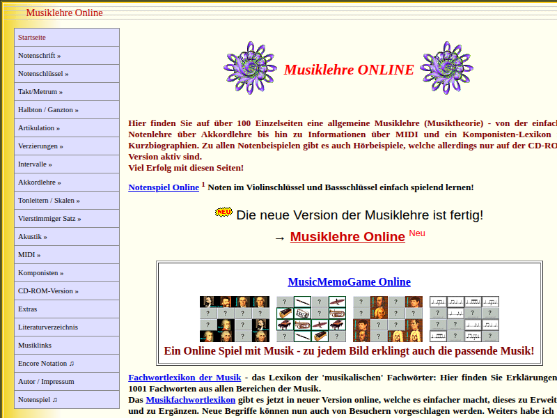 – eine allgemeine Notenkunde (Musiklehre Online) von der einfachen Notenlehre über Intervalle, Akkordlehre,Akustik bis hin zu Informationen über MIDI und ein Komponisten-Lexikon mit Kurzbiographien…
