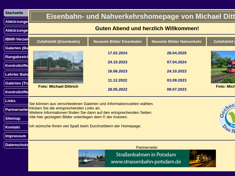 Eisenbahnhomepage mit Bildern der Eisenbahn, Straßenbahn, dem IBNR-Verzeichnis und Abkürzungsverzeichnis