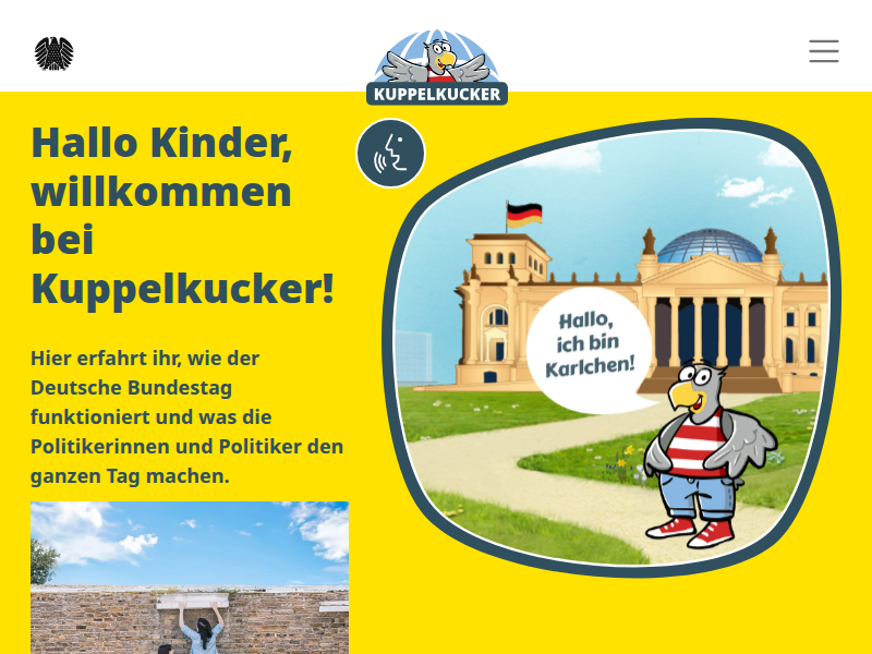 Politik für Kinder: Wie entsteht ein Gesetz? Wie wird der Bundestag gewählt? Was passiert in einer Sitzungswoche? Auf dem Kinderportal Kuppelkucker.degibt es Erklärtexte, Videos, Spiele und Podcasts rund um das Geschehen im Deutschen Bundestag.