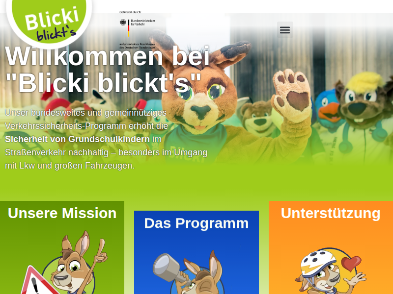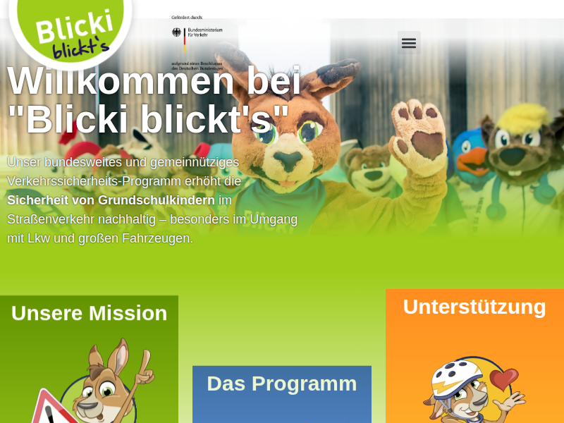 Willkommen bei „Blicki blickt’s“ Unser bundesweites und gemeinnütziges Verkehrssicherheits-Programm erhöht die Sicherheit von Grundschulkindern im Straßenverkehr nachhaltig – besonders im Umgang mit Lkw und großen Fahrzeugen. Unsere Mission MEHR ERFAHREN Das Programm MEHR ERFAHREN Unterstützung MEHR ERFAHREN Der Blicki-Schulweg-Check So viele Unfälle passieren auf dem Schulweg Ihres Kindes. Geben Sie die Start-Adresse und die Adresse der […]
