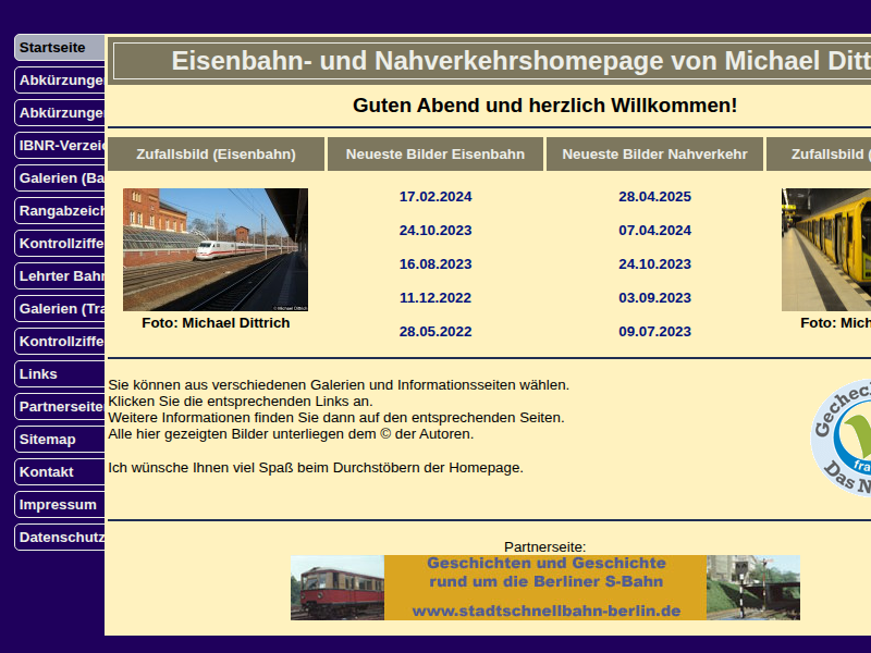 Eisenbahnhomepage mit Bildern der Eisenbahn, Straßenbahn, dem IBNR-Verzeichnis und Abkürzungsverzeichnis