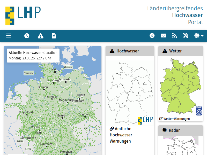Farben Links zu allen Hochwasserportalen der Bundesländer Uhrzeit für den Aktualisierungsstand LHP-Logo
